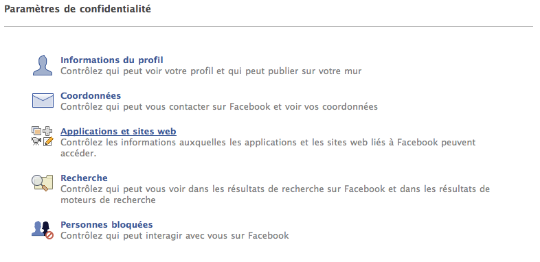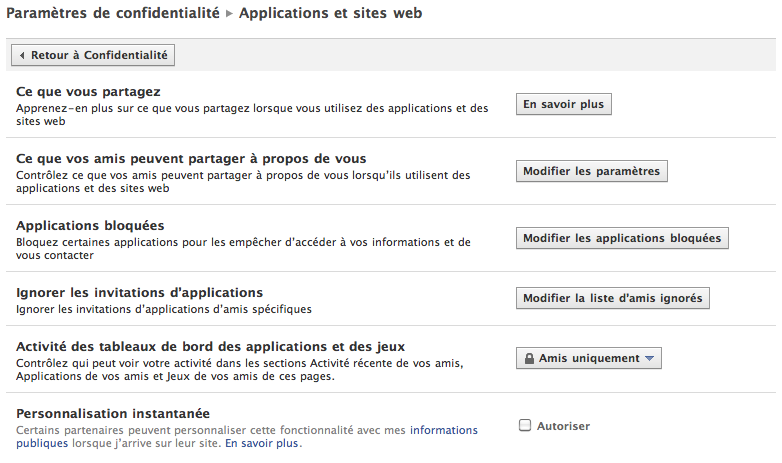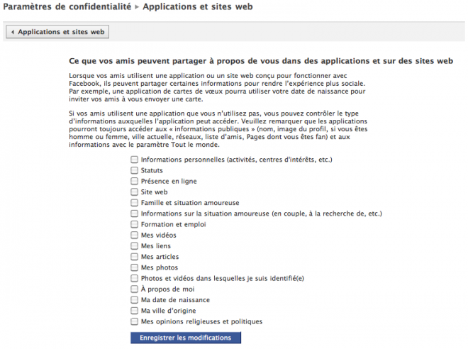 Il s’agit des informations personnelles que vos amis ont le droit de balancer à d’autres (du genre via des applications). Oui, ça surprend n’est ce pas ? Vous n’êtes pas vraiment maître de vos données personnelles tant que vous n’avez pas décoché TOUTES les cases de cette pages (sauf celles bien sûr que vous voulez continuer à laisser circuler sans contrôle. Pour moi ça sera « Mes articles » qui restera coché mais uniquement ça.)