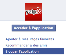 On a presque fini. La dernière étape consiste à bloquer à l’avance les applications qui ont déjà établi un partenariat avec FB pour vous piquer vos informations personnelles. Si on lit la FAQ de Facebook, il s’agit de yelp, docs et pandora. Rendez vous sur chacune des pages de leur application et cliquez avec conviction (j’ai dit CONVICTION !!!) sur « Bloquer cette application ».