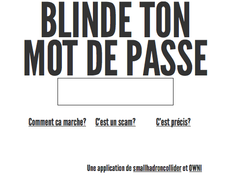 Pour vous aider à choisir un bon mot de passe, nous avons adapté l’application crée par smallhadroncollider, How Secure is my Password ? Si après ça vous êtres toujours en manque d’imagination, lisez ces conseils pour choisir un bon mot de passe.