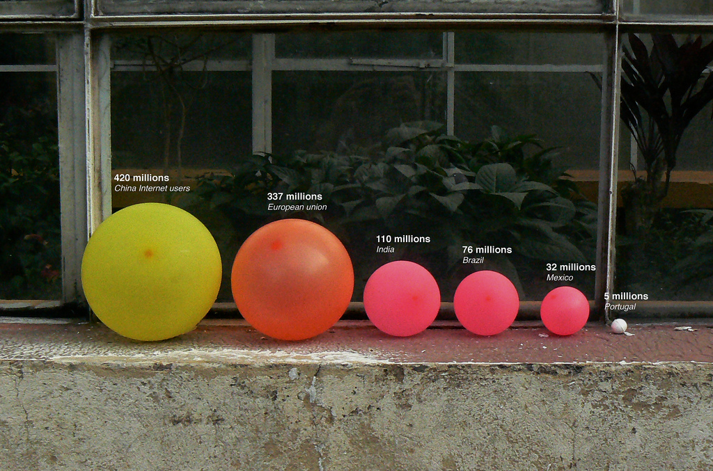 On voit très clairement que l’augmentation des utilisateurs d’Internet entre 2000 et 2010 fut extrême. C’était l’idée principale derrière cette visualisation. Et plutôt que de me limiter à donner des chiffres pour chaque année, j’ai fait enfler un ballon. Il ajoute : Je sais bien que ce n’est pas la forme la plus précise pour faire un graphique, cependant le ballon, une forme abstraite, permet de représenter cette idée de manière tangible.”