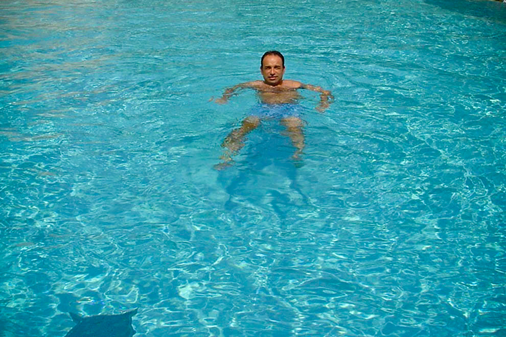 Carpe diem dans la piscine de Takieddine. C’est d’abord un souvenir. Souvenir de quoi ? Pour qui ? Nous verrons… La photographie ne dit rien d’autre que “Jean-François est dans la piscine et me regarde”. Rien de plus courant – si ce n’est que la maison a l’air très luxueuse – rien de que la banalité de la vie heureuse et confortable de ceux qu’on appelle les nantis.