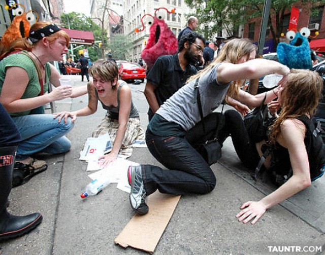 Le hashtag2 #occupysesamestreet a ensuite fait florès sur Twitter, et les adeptes du détournement photographique ont fait montre de leur art, notamment sur le site Tauntr. Jusqu’à moquer gentiment le mot d’ordre d’Occupy Wall Street: “Nous sommes les 99%” (We are the 99%) -qui symbolise l’injustice de la répartition des richesse aux Etats-Unis- en le transformant en “99% des cookies sont consommés par 1% des monstres”.