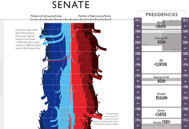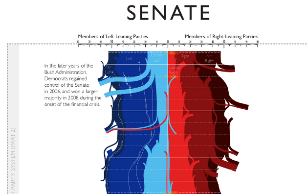 Sous la forme de deux réseaux d’artères sinuant entre l’extrême gauche et l’extrême droite, chacun pour une chambre, cette magnifique infographie publiée sur le site xkcd montre continuité et rupture du Sénat et de la Chambre des représentants. Au milieu, guerres et administrations se succèdent, séparant les ventricules. À l’opposé de l’iconographie européenne, les bleus sont ici les démocrates et les républicains figurés en rouge, l’épaisseur de chaque trait étant proportionnée au nombre de parlementaires se revendiquant de chaque mouvance. Quand les branches se rejoignent, c’est qu’une tendance gagne des élus, quand elle tend vers l’extérieur pour s’interrompre, c’est le signe de défection et de l’affaiblissement du mouvement.