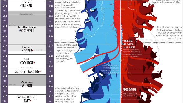Séparé par une colonne figurant administrations et principaux conflits ayant marqué l'histoire américaine, l'arbre détaille les grands débats et retournements politiques qui ont accompagné les moments forts de sa vie politique, comme ici le raz de marée centriste chez les démocrates de la Chambre des représentants à la fin des années 1920, qui a porté le New Deal de Roosevelt, ou l'émergence récente du Tea Party chez les Républicains.